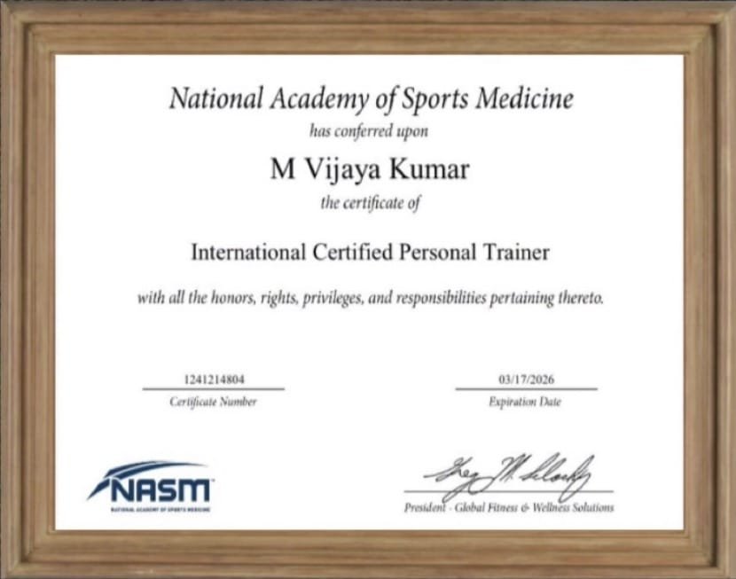 With over 23 years of excellence in the fitness industry, M. Vijay brings world-class expertise to the heart of Vadavalli. As a dual-certified personal trainer, he combines scientifically proven training methods with extensive hands-on experience to deliver exceptional results.