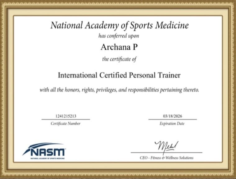 Bringing over 13 years of passion and expertise to the fitness industry, Archana is a dynamic force behind our transformation-driven community. As a NASM-certified trainer and an Elite Zumba Instructor (Level 1 & 2, Aqua Zumba, Kids Zumba), she blends scientifically proven training methods with high-energy dance fitness to deliver powerful, real-world results.